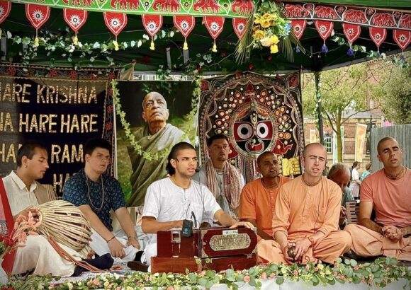 Events included a music-mantra tribute at the Liverpool Philharmonic Hall, hari nāma processions across the city centre, panel discussions and interviews at the two Beatles museums, including a drum workshop at the fabled Fab4 Café.