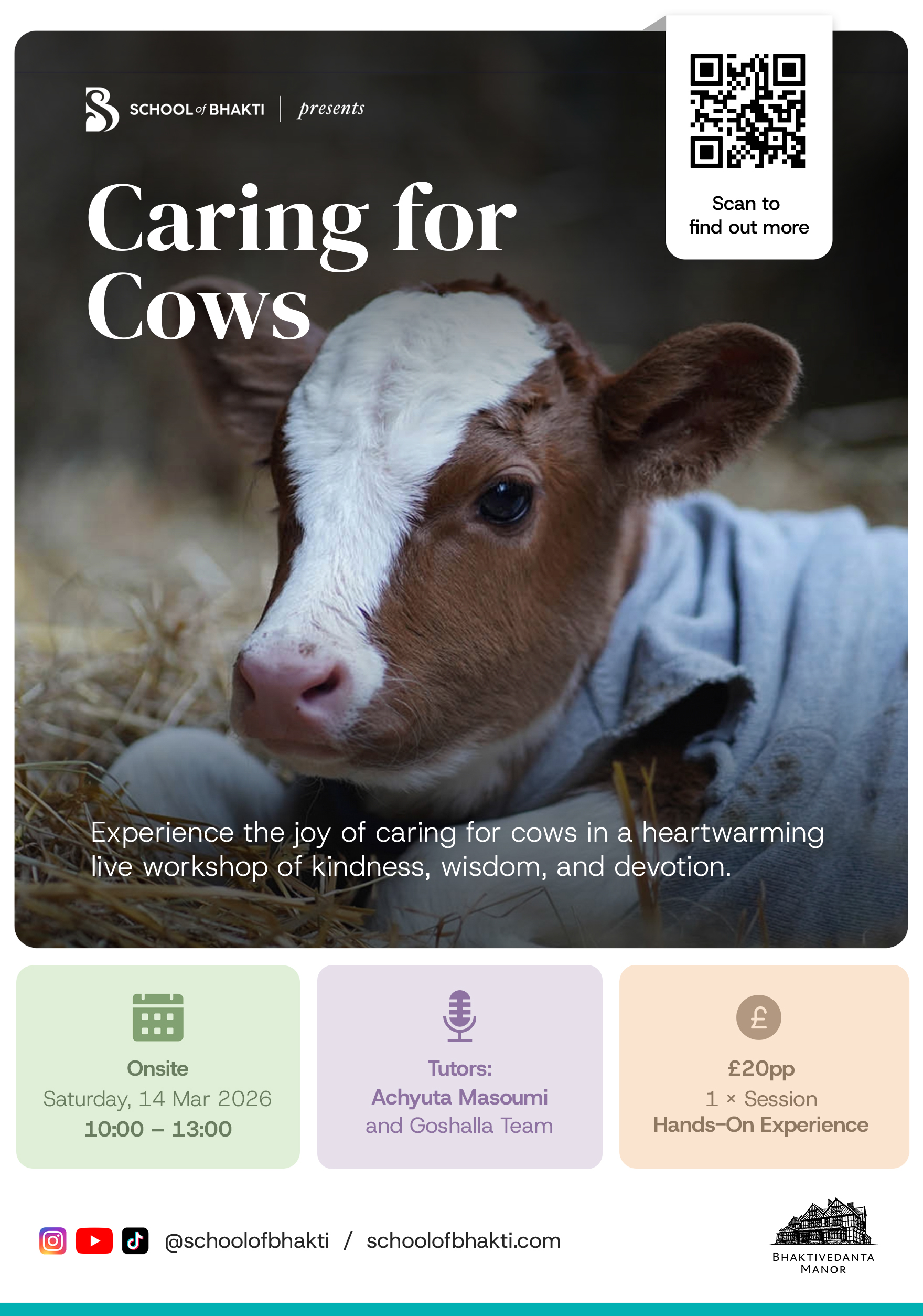 • Compassion in Action: Discover the spiritual teachings of compassion from the Bhagavad Gita and how they guide our relationships with all living beings, including cows. • Hands-On Care: Learn how to properly care for cows by feeding them, grooming them, and understanding their unique needs. • Connection with Animals: Experience the deep, non-verbal communication that exists between humans and animals, fostering a bond of love and trust. • Spiritual Principles of Animal Care: Understand the sacred role cows play in spiritual practices and how tending to them can deepen your own spiritual journey.