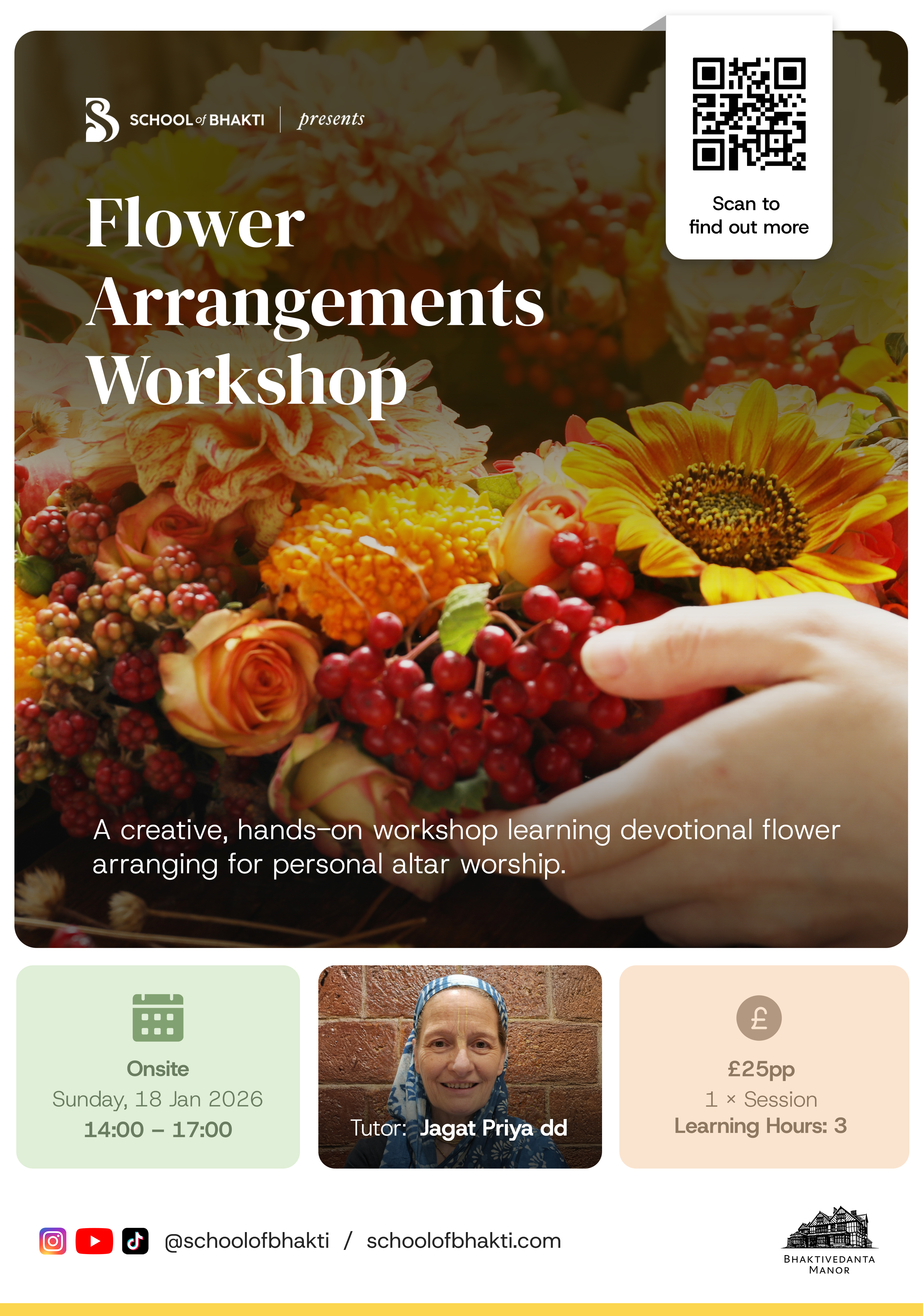 Discover the art of devotional flower arranging in this creative and hands-on workshop. This session is designed to teach you the fundamental techniques of floral arrangement while cultivating beauty for sacred spaces.