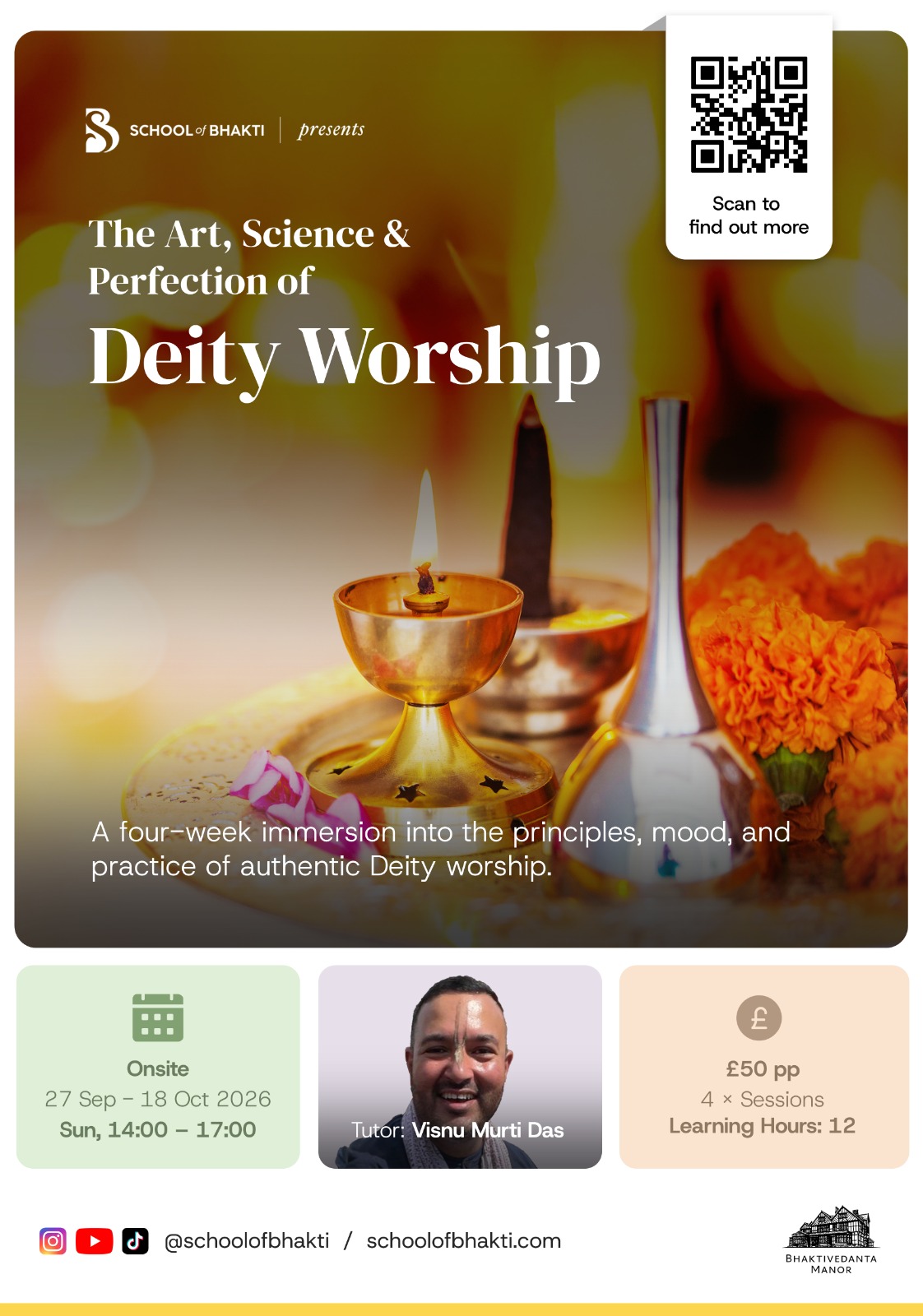 A 4-Week Immersive Course with School of Bhakti Deity worship is a profound spiritual practice that harmonises devotion, discipline, and personal transformation. This 4-week course offers a balanced blend of philosophy, practical guidance, and inner cultivation to help students understand and deepen their connection with Krishna through the sacred art of worship. Whether you are new to deity worship or looking to refine your practice, this course provides a comprehensive and uplifting learning journey.