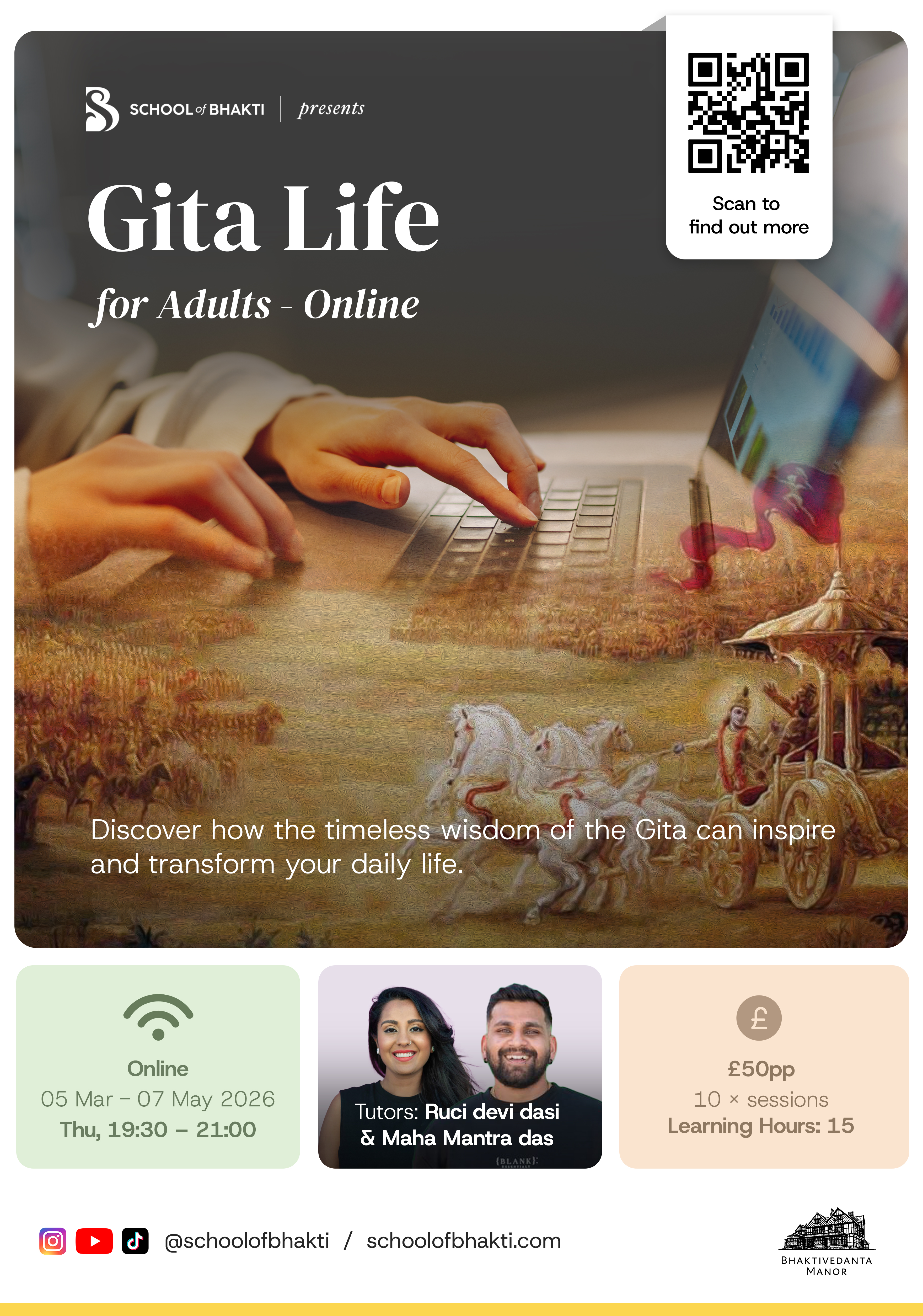 Together, they bring a contemporary and grounded approach to devotional teaching, shaped by long-term practice and real-life experience. Their style is light-hearted and engaging, while remaining faithful to the depth and discipline of the Bhagavad-gītā. Through this course, they aim to support students in understanding the Gītā clearly and applying its teachings practically within daily life, work, and relationships.