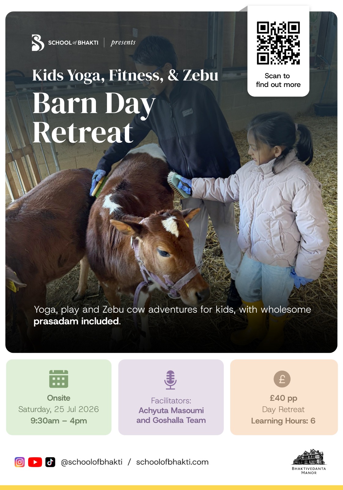 930am Registrations and Refreshments in Gaura Room 10am Welcome Presentation and Icebreaker 10.30am Split into groups and rotated activities * Meet and learn about our gentle Zebu cows * Ride on a traditional Ox Cart – an unforgettable ride! * Help prepare cosy bedding for the cows * Jump, climb and laugh in our Hay Playground * Get creative with Chalk Painting in the sunshine 1pm Lunch 2pm Yoga, Games and Fitness Session 330pm Snacks 345pm Kirtan 4pm End