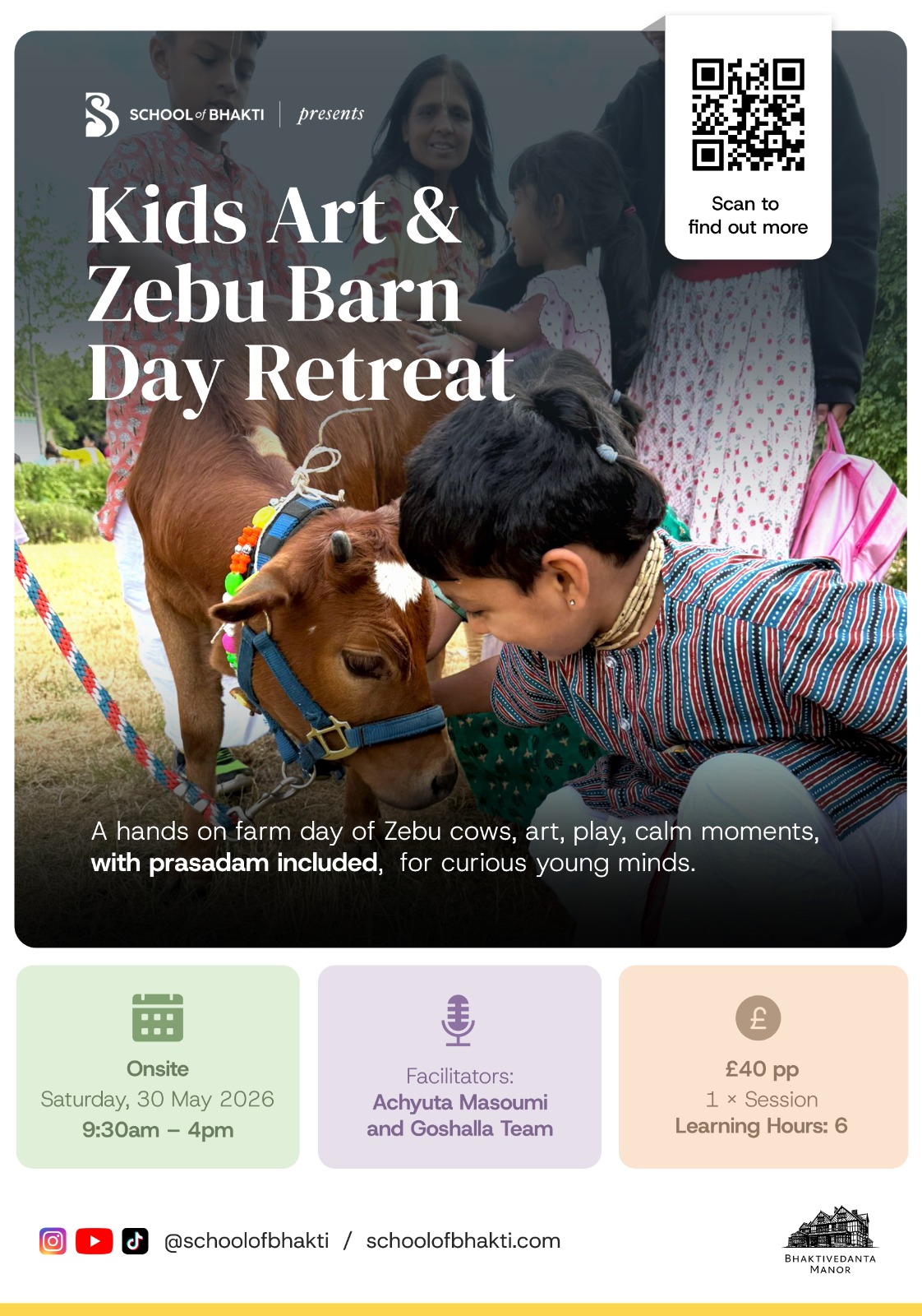 930am Registrations and Refreshments in Gaura Room 10am Welcome Presentation and Icebreaker 10.30am Split into groups and rotated activities * Meet and learn about our gentle Zebu cows * Ride on a traditional Ox Cart – an unforgettable ride! * Help prepare cosy bedding for the cows * Jump, climb and laugh in our Hay Playground * Get creative with Chalk Painting in the sunshine 1pm Lunch 2pm Art and Meditation Session 330pm Snacks 345pm Kirtan 4pm End