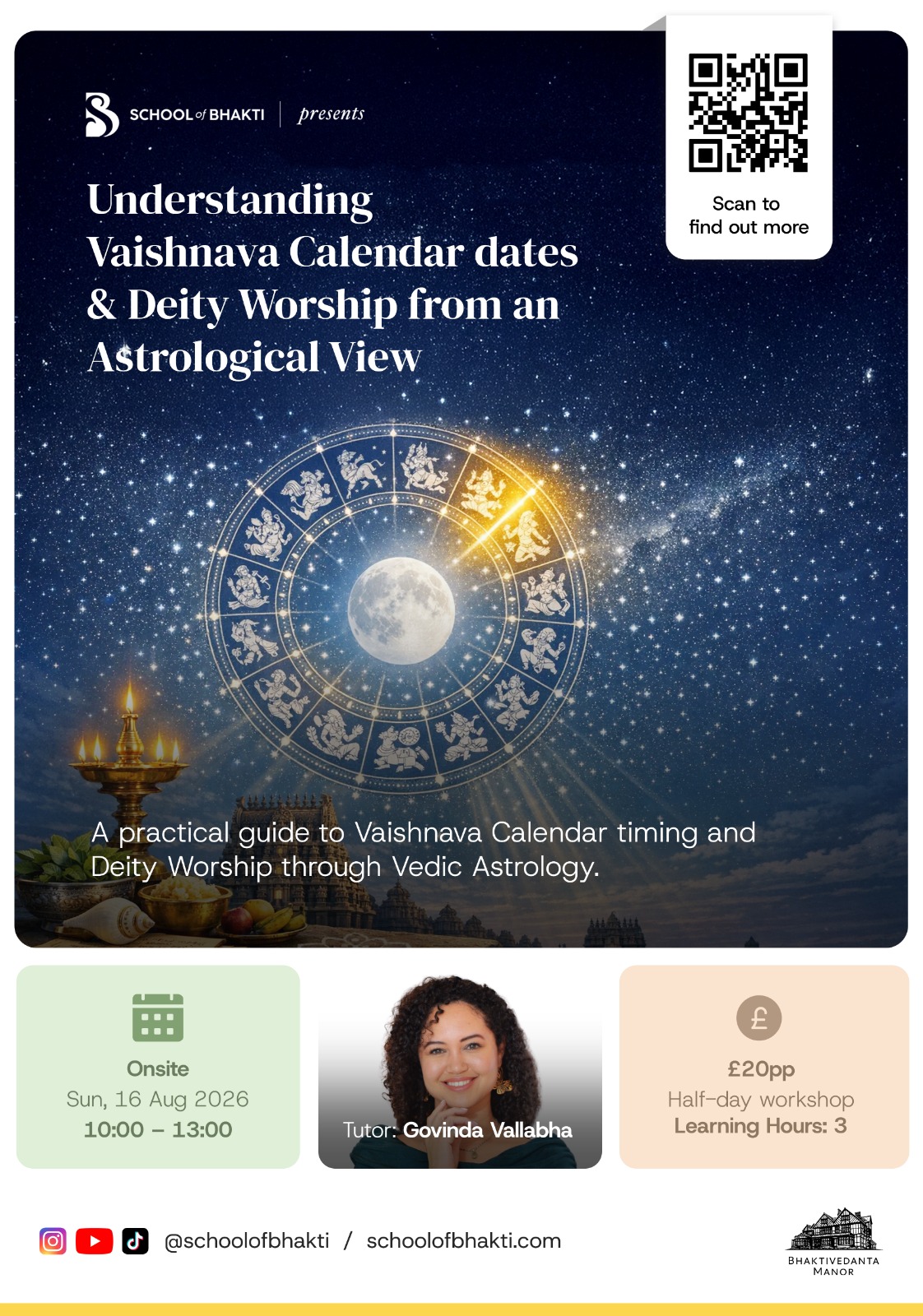 The Vaishnava calendar is not symbolic — it is astronomical. Every Ekadashi, Purnima, and festival observance is rooted in precise lunar and planetary calculations. But how does it actually work? In this workshop, we will explore the astrological intelligence behind the Gaudiya Vaishnava calendar. You will gain clarity on the meaning of key tithis such as Ekadashi and Dvadashi, why the Moon governs devotional timing, and how sacred days are calculated according to Vedic astronomy. We will also examine the pivotal role of Srila Bhaktisiddhanta Saraswati Thakur in refining the Vaishnava calendar. Going further, we will uncover how priests and pujaris apply astrological principles in daily worship from selecting Deity outfit colours according to planetary rulership, to choosing auspicious timings (muhurta) for yajnas and ceremonies. This session offers both philosophical depth and practical understanding, revealing how devotional life is harmonised with cosmic order. You will walk away seeing the calendar not as dates on a page, but as a living expression of sacred time.