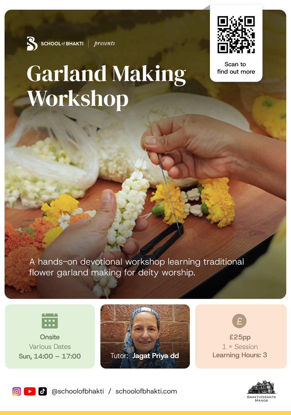 During the session, you will: - Learn step-by-step garland-making techniques - Discover how to pair different flowers, colours, and textures harmoniously - Create a small garland sized especially for Gaura Nitai deities - Take home the garland you make as well as your new skills