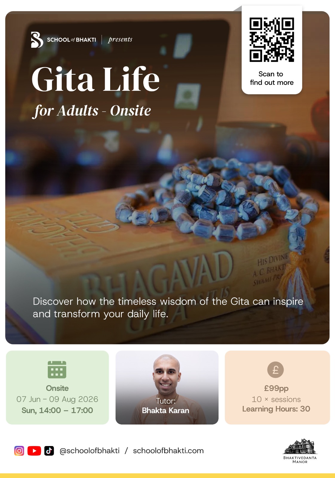 - Key Life Lessons such as dharma, karma, and yoga. • Gita Acronyms to simplify and apply the teachings in your personal and professional life. • Strategies for navigating life’s challenges with clarity and confidence. What to Expect: • A supportive and open environment to connect with like-minded individuals. • Practical insights to cultivate inner peace and purposeful action. • Opportunities to reflect on your values and awaken your Inner Arjuna—the hero within. This course is perfect for anyone seeking personal growth, a deeper understanding of life’s purpose, or a way to apply ancient wisdom in a modern world.