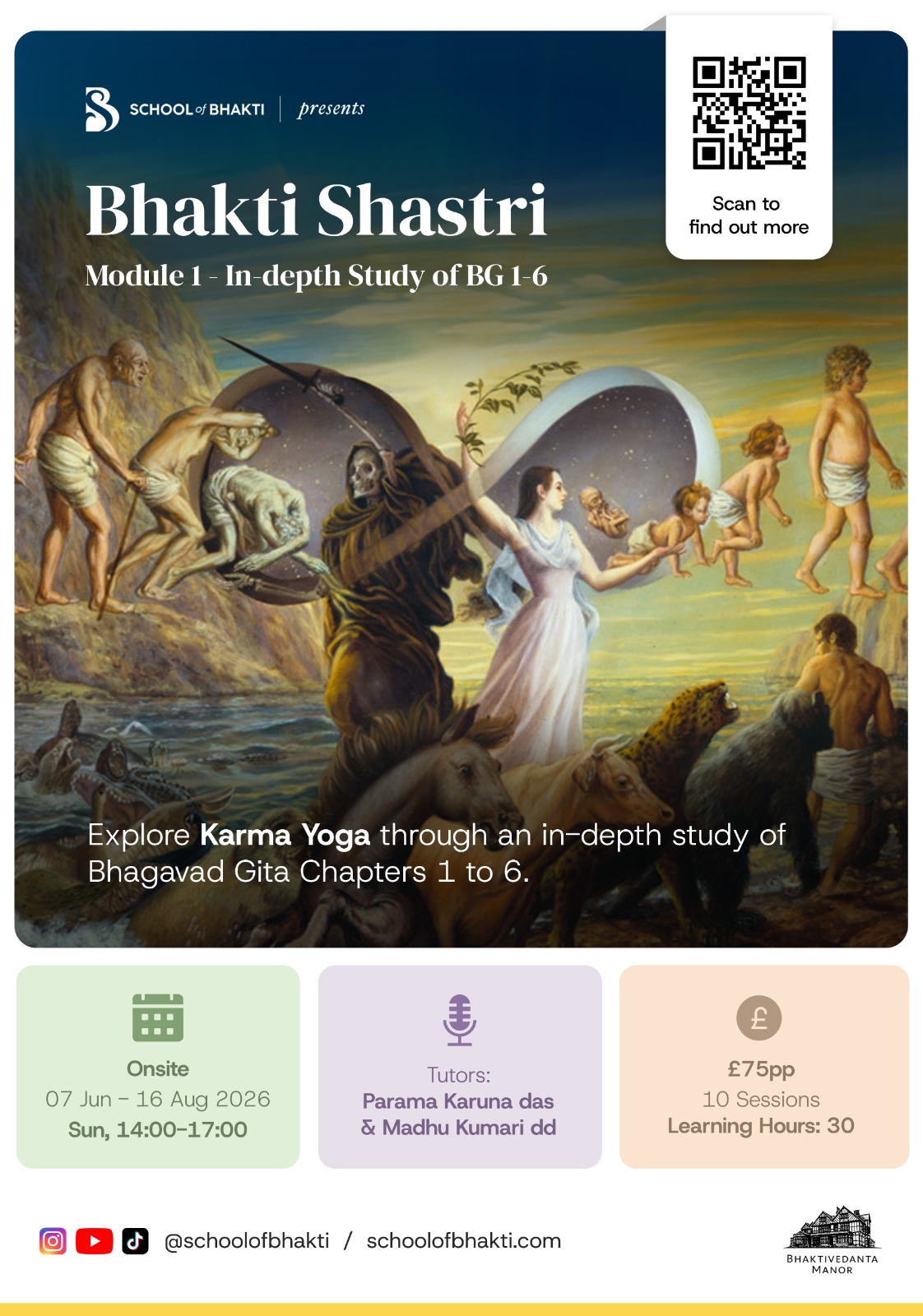 This module is an integral part of the Bhakti Sastri Qualification. The program consists of six modules, each spanning ten weeks. Conducted exclusively onsite, this course delves deeply into the various topics covered by each module. While assessments at the end of each module are optional, successfully completing all required assessments across the six modules will earn you the prestigious Bhakti Sastri Qualification. Notably, there is no strict order for completing the modules; the flexible approach of this module-style Bhakti Sastri allows you to choose your own sequence.