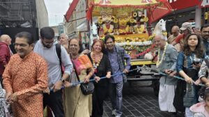 Once the Rath had arrived from London, a traditional opening ceremony commenced, which included the breaking of coconuts. A host of dignitaries participated, including Paula Barker, MP for Liverpool Wavertree, plus Cllr Nick Small, Cllr Steve Radford, and Cllr Pat Moloney from Liverpool City Council. Also present was Mr Divyesh Patel, Chair of the Shree Radha Krishna Temple,
