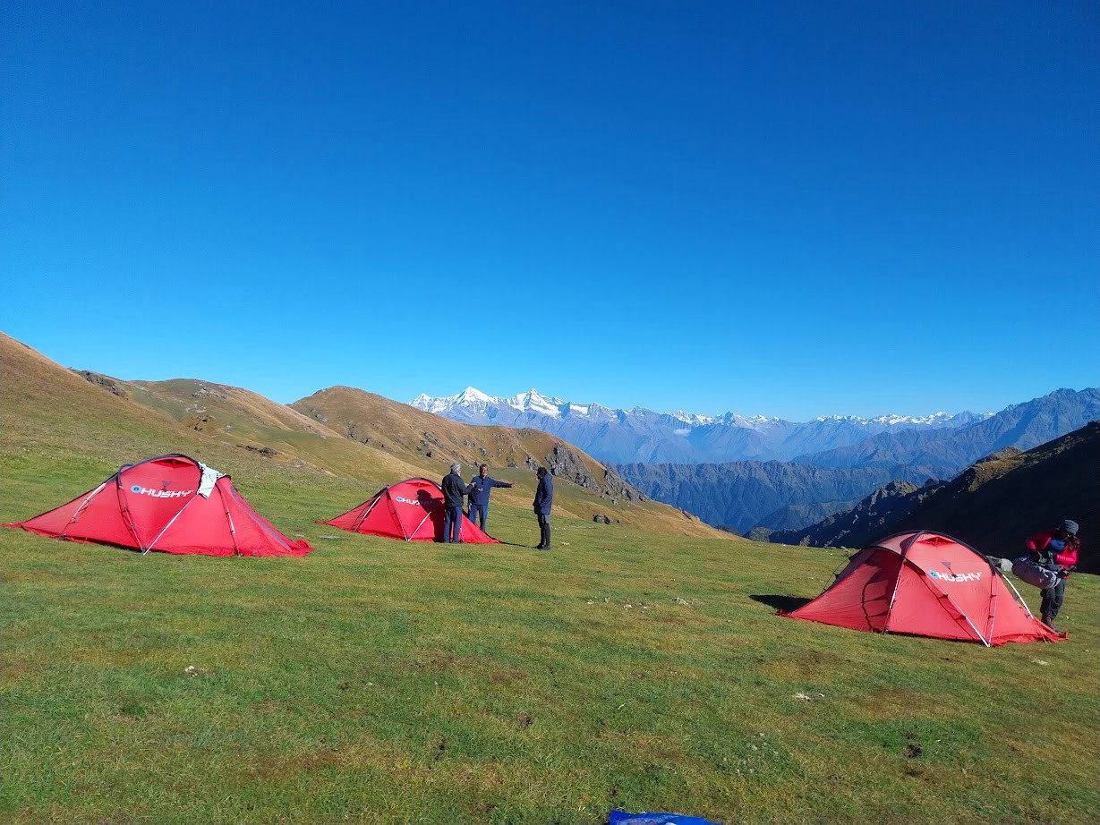 Ascend to Surya Top and Uchlaru Top, offering 360° Himalayan views including Bandarpunch, Draupadi Ka Danda, Jaonli, Srikanth, and Gangotri I, II, III. Return along the ridge to Syari Bugyal. Overnight in tents.
